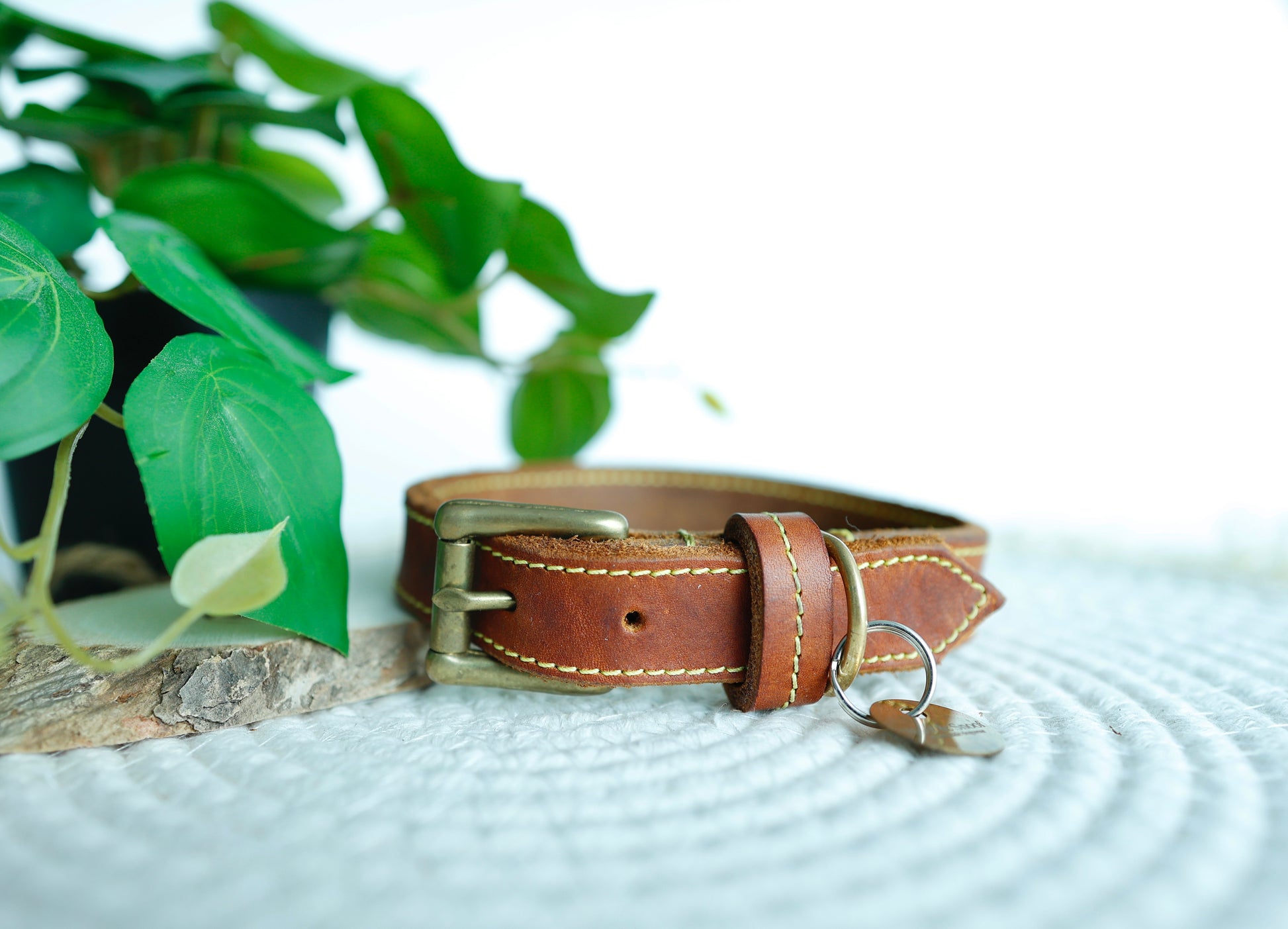 Een prachtige halsband in cognac kleur met een geel stiksel. handgemaakt in kwaliteitsvol vetleder. Het leder is zeer soepel en wordt alleen maar mooier naarmate het gebruik.
